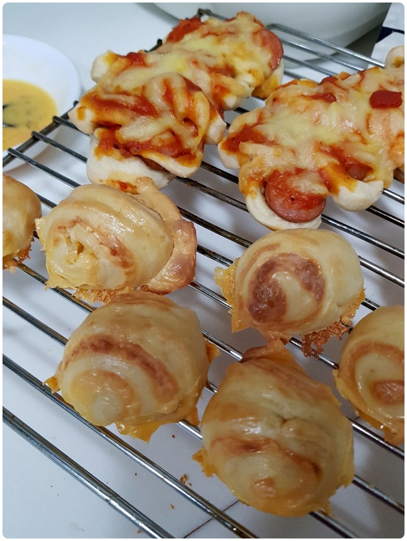 호떡믹스로 호떡만들때와 같은 농도의 반죽을 만들어 밀대로 밀어서 위에 치즈를 넣고 말아주고 적당한 크기로 잘라서 위에 계란물을 살짝 묶혀줬습니다. 다음에는 시나몬가루를 살짝 넣어서 치즈롤을 만들어볼까합니다. 빵반죽에 향을 더하면 조금 더 좋겠다는 생각이 들었어요.